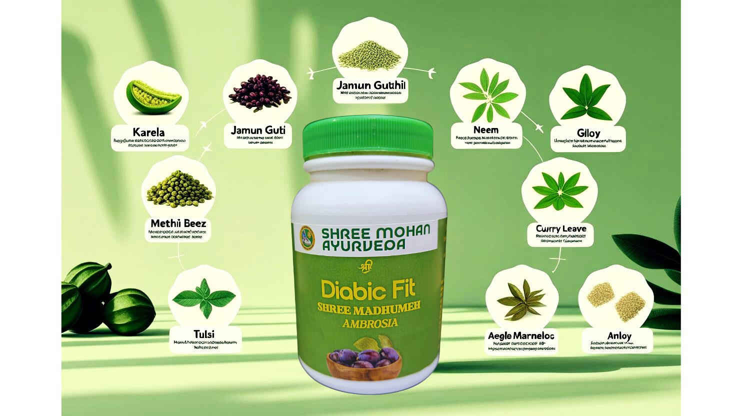 Diabic Fit Shree Madhumeh Ambrosia is a potent Ayurvedic capsule blend featuring Jamun, Gudmar, Karela, and Turmeric. This herbal formula helps regulate blood sugar levels naturally while boosting energy and digestion. Regular use may relieve fatigue, abnormal thirst, and appetite issues commonly associated with mild diabetes. Crafted to support internal balance, it enhances metabolic and immune wellness. Free from chemicals, it’s a safe and effective daily supplement for managing pre-diabetes or maintaining healthy sugar levels naturally.