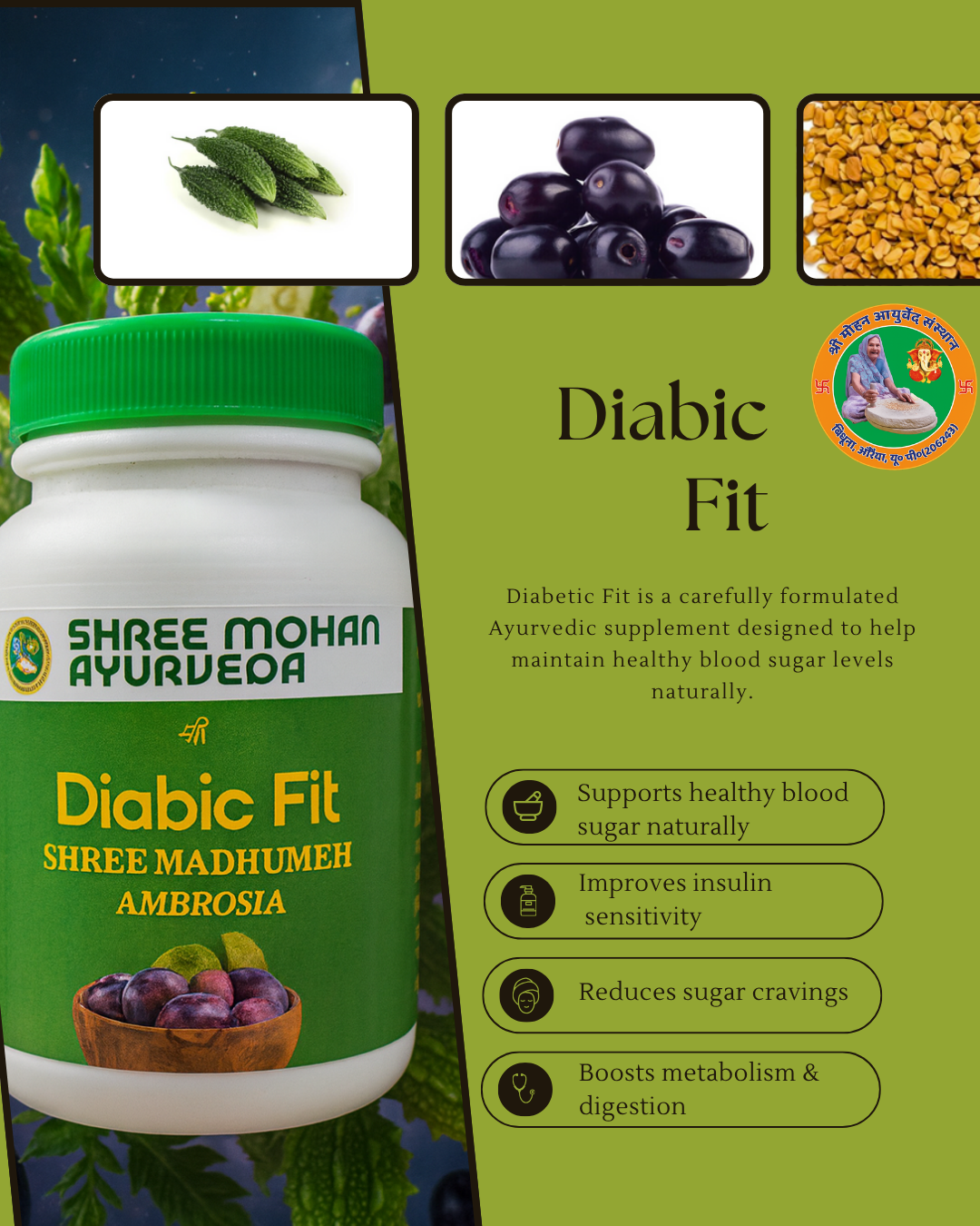 Diabic Fit Shree Madhumeh Ambrosia is a potent Ayurvedic capsule blend featuring Jamun, Gudmar, Karela, and Turmeric. This herbal formula helps regulate blood sugar levels naturally while boosting energy and digestion. Regular use may relieve fatigue, abnormal thirst, and appetite issues commonly associated with mild diabetes. Crafted to support internal balance, it enhances metabolic and immune wellness. Free from chemicals, it’s a safe and effective daily supplement for managing pre-diabetes or maintaining healthy sugar levels naturally.